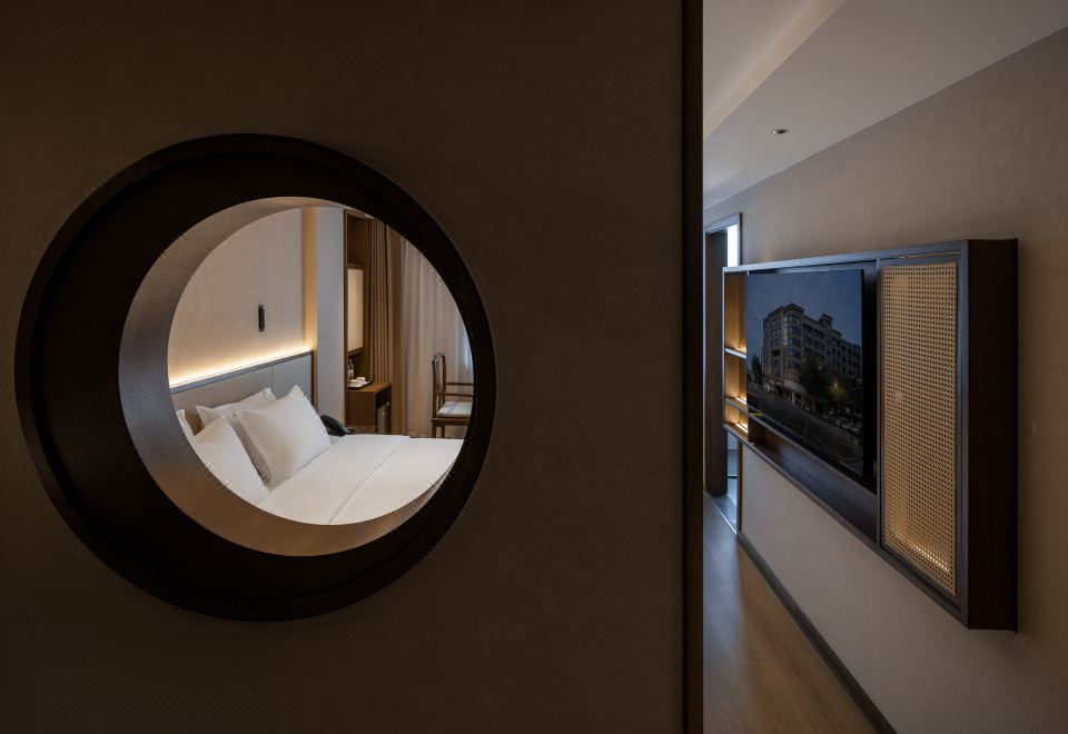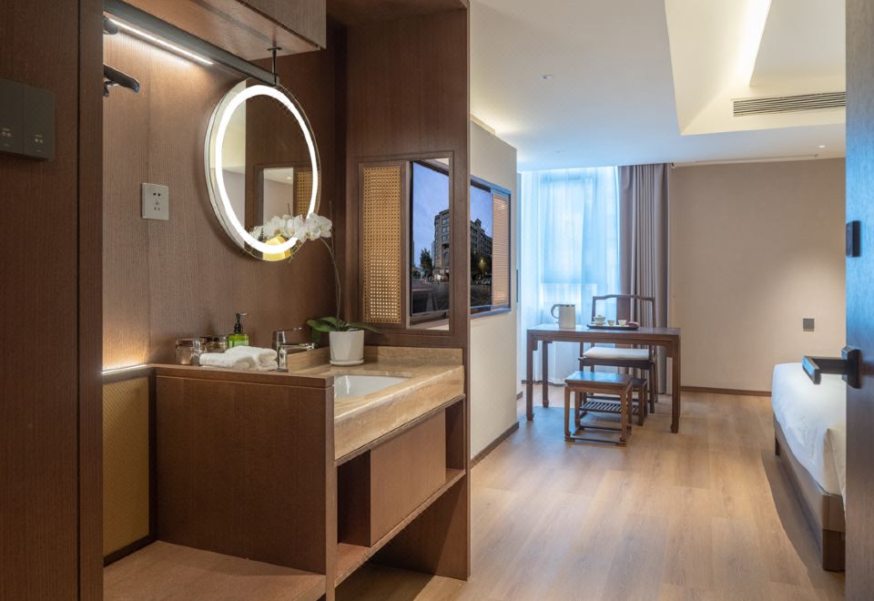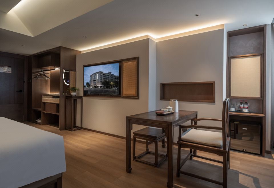 伴溪月大床房(金可儿床垫+原木茶桌+中式床榻+顶喷)